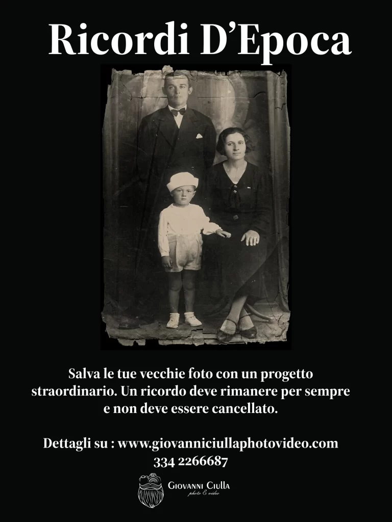 Giovanni Ciulla Photo & Video = propone un progetto di digitalizzazione dei tuoi ricordi D’ Epoca, passando dalle vecchie stampe stampa fotografiche alla fase di salvataggio ed in parte piccole correzione delle stesse, per riproporle in versione digitale.